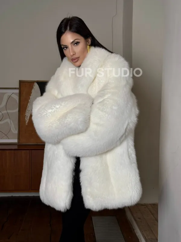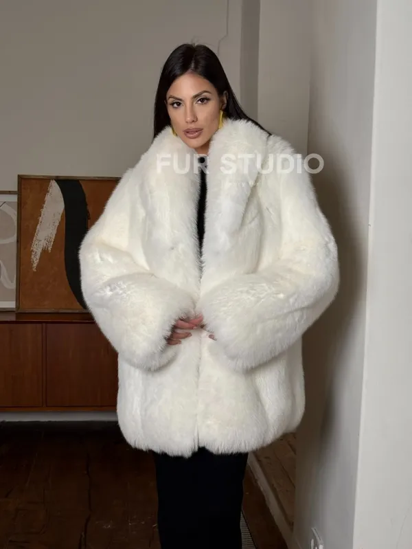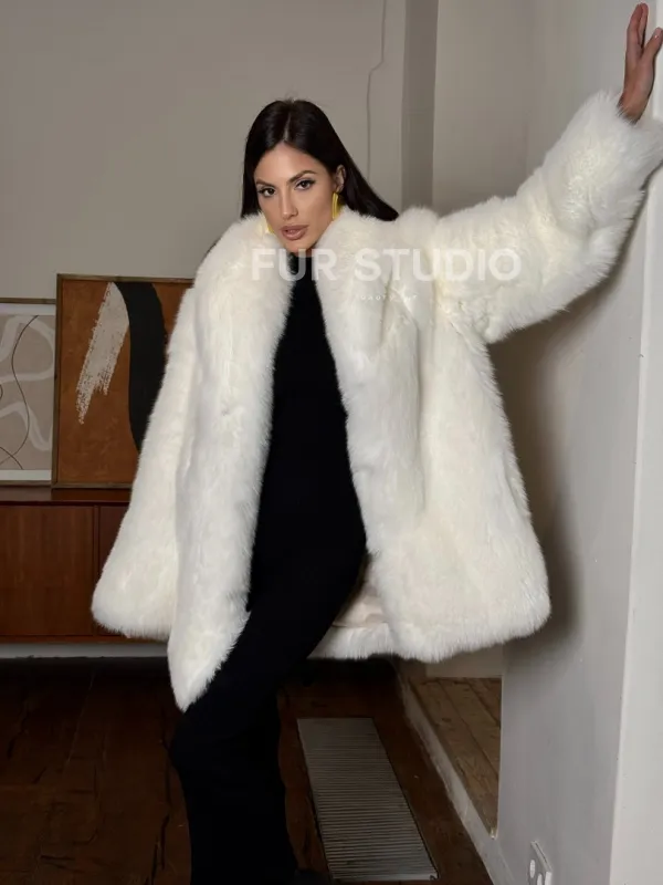 Белая шуба из меха лисы - воротник шаль 101456