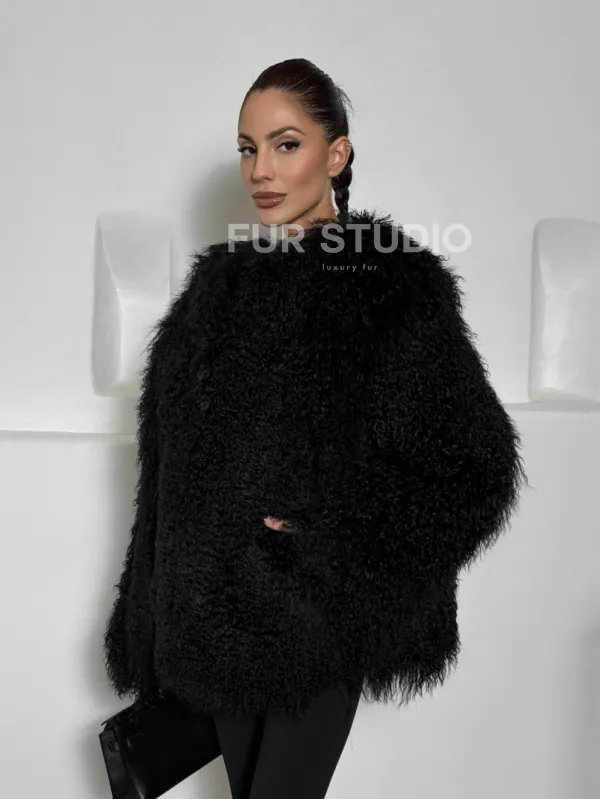 Черная шуба из меха ламы воротник шанель 101496