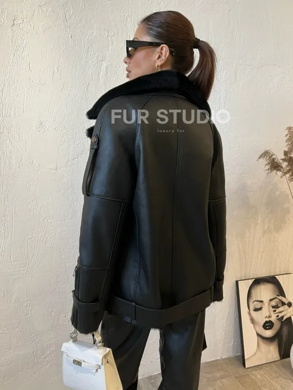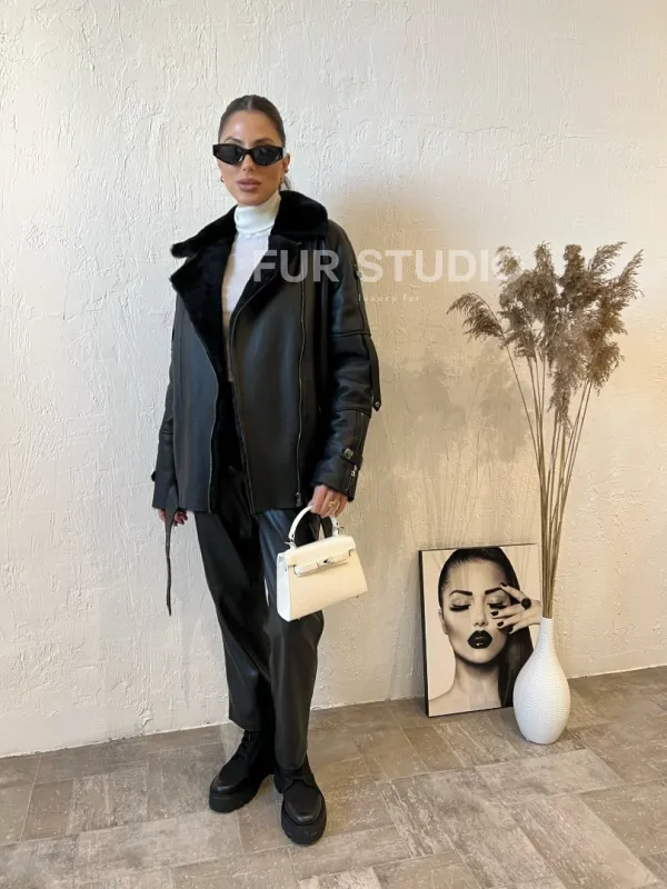 Дубленка авиатор в черном цвете из натуральной овчины 100371