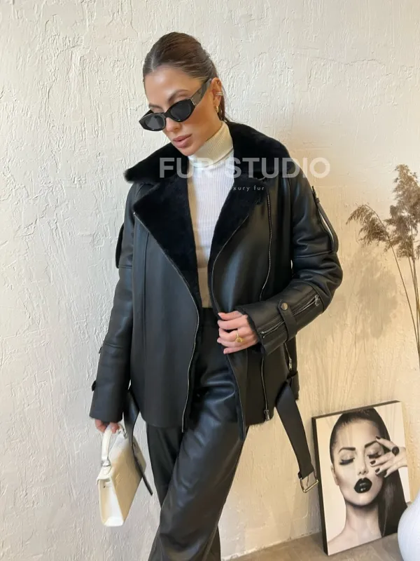 Необычный пояс по окантовке дубленки смотрится оригинально. Модель подойдет к базовому гардеробу, сочетается с джинсами и леггинсами. Если добавить к lookу грубые ботинки и кожаный рюкзак, то вы будете выглядеть, как с обложки. Купить дубленку авиатор в черном цвете из натуральной овчины могут дамы, которые разбираются в трендах и идут в ногу со временем.