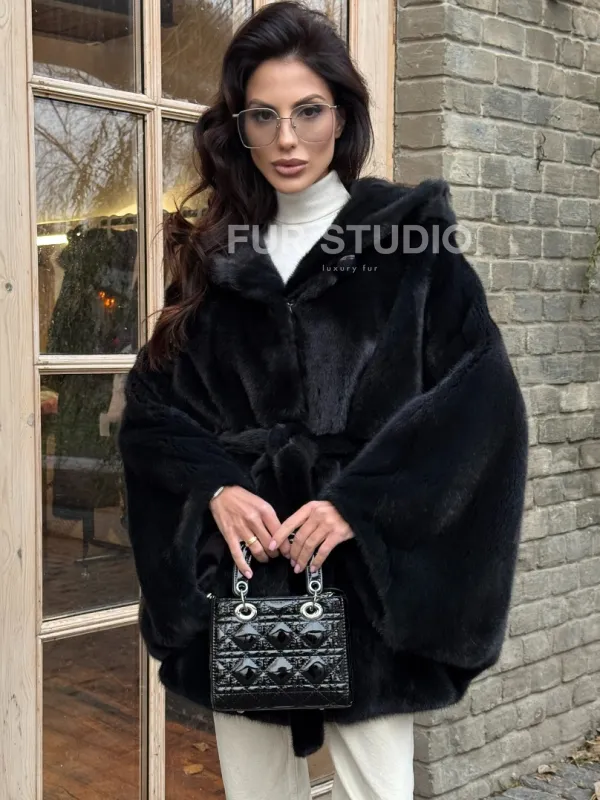 Меховое пончо из скандинавской норки с капюшоном - черный изумруд 101415