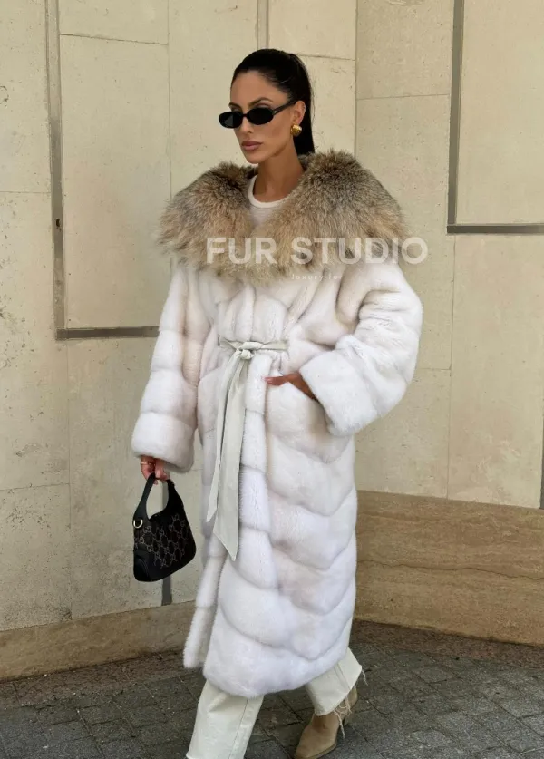 Мех данной шубы аукционная норка, цвет белый. Предлагается в размерах от 42 до 54. Длина модели 115-120 см, что выгодно подчеркивает фигуру девушек. Эта модель идеально подойдет для девушек и женщин, предпочитающих роскошные натуральные меха.