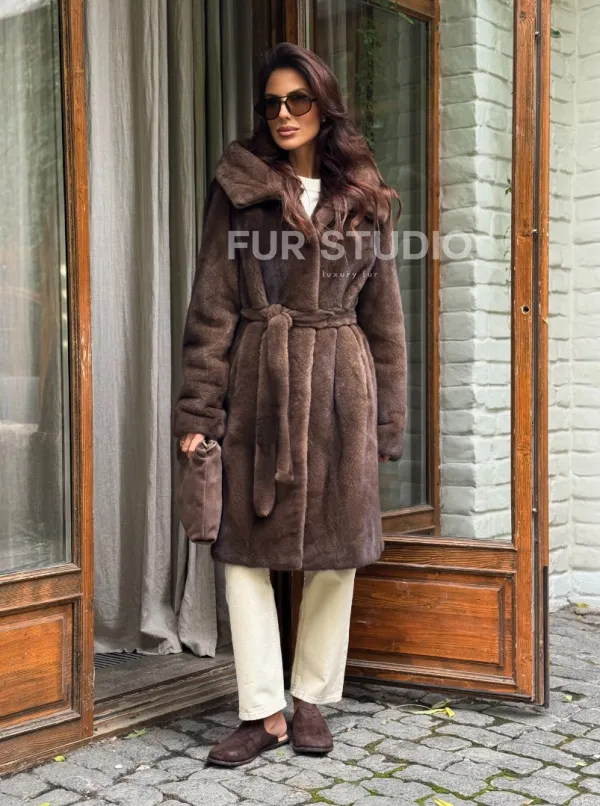 Мех данной шубы аукционная норка, цвет коричневый. Предлагается в размерах от 42 до 48. Длина модели 95-100 см, что выгодно подчеркивает фигуру девушек. Эта модель идеально подойдет для девушек и женщин, предпочитающих роскошные натуральные меха.