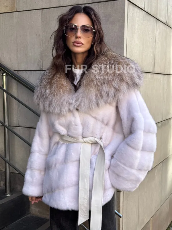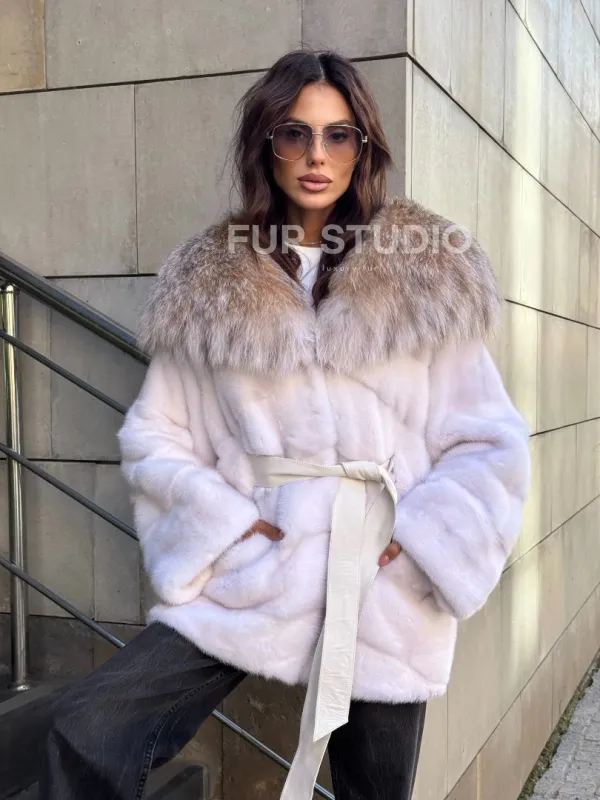 Шуба-пончо из меха норки с капюшоном из рыси – выбор утонченных дам с изысканным стилем. В модели вы будете выглядеть роскошно и женственно. Необычный крой подчеркивает достоинства фигуры. Оригинальный пояс очертит талию и визуально создает фигуру типа «песочные часы». Оптимальная длина удобна в носке и не сковывает движения.