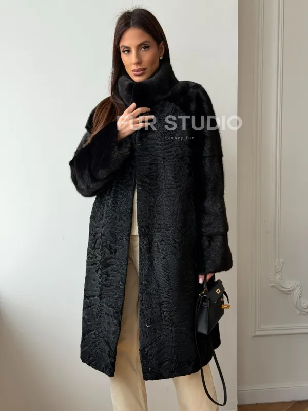 Шуба из каракуля с норкой - стойка воротник доступна для покупки в нашем шоуруме Furs Studio в . У нас так же есть доставка во все города России. Добавьте немного роскоши в свой гардероб с этой шубой, которая будет служить вам многие годы.
