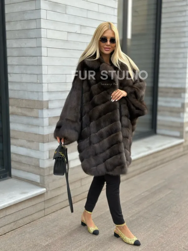 Укороченная шуба из натурального некрашеного меха баргузинского соболя нравится активным и уверенным в себе женщинам. Свободный крой с широкими рукавами не стесняет движений, а благодаря длине чуть выше колена в шубе удобно гулять по городу без страха испортить подол брызгами противогололедного реагента.