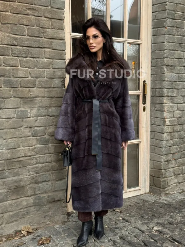 Удлиненная шуба из меха норки с капюшоном куница 101425